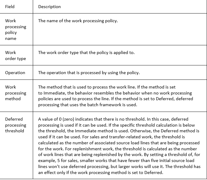 Policies are configured on the Work processing policies page. The following table describes the fields on that page.